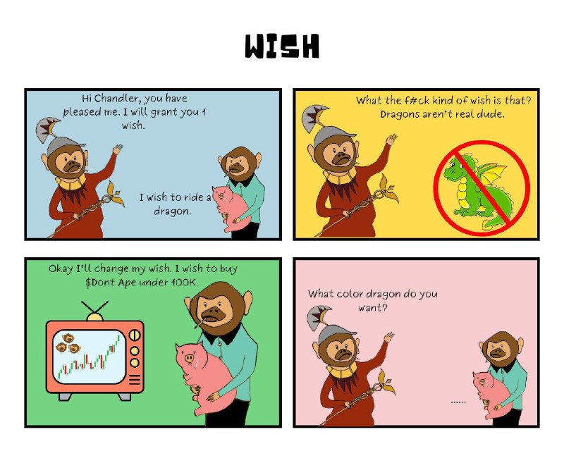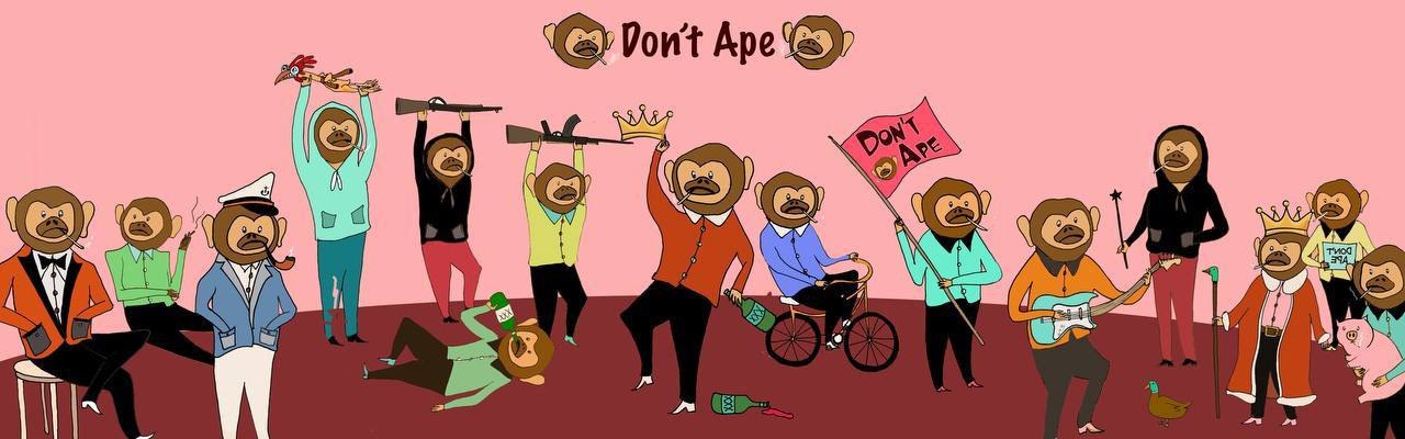 Don’t Ape is a 0% tax community coin utilizing 100% hand-drawn art. Our liquidity is locked, our contract is renounced; and our intent is to forge ourselves into a house-hold brand. Through our art, stories, partnerships, rewards, and NFT’s tied 1:1 to physical products – we’re confident we’ll do just that.